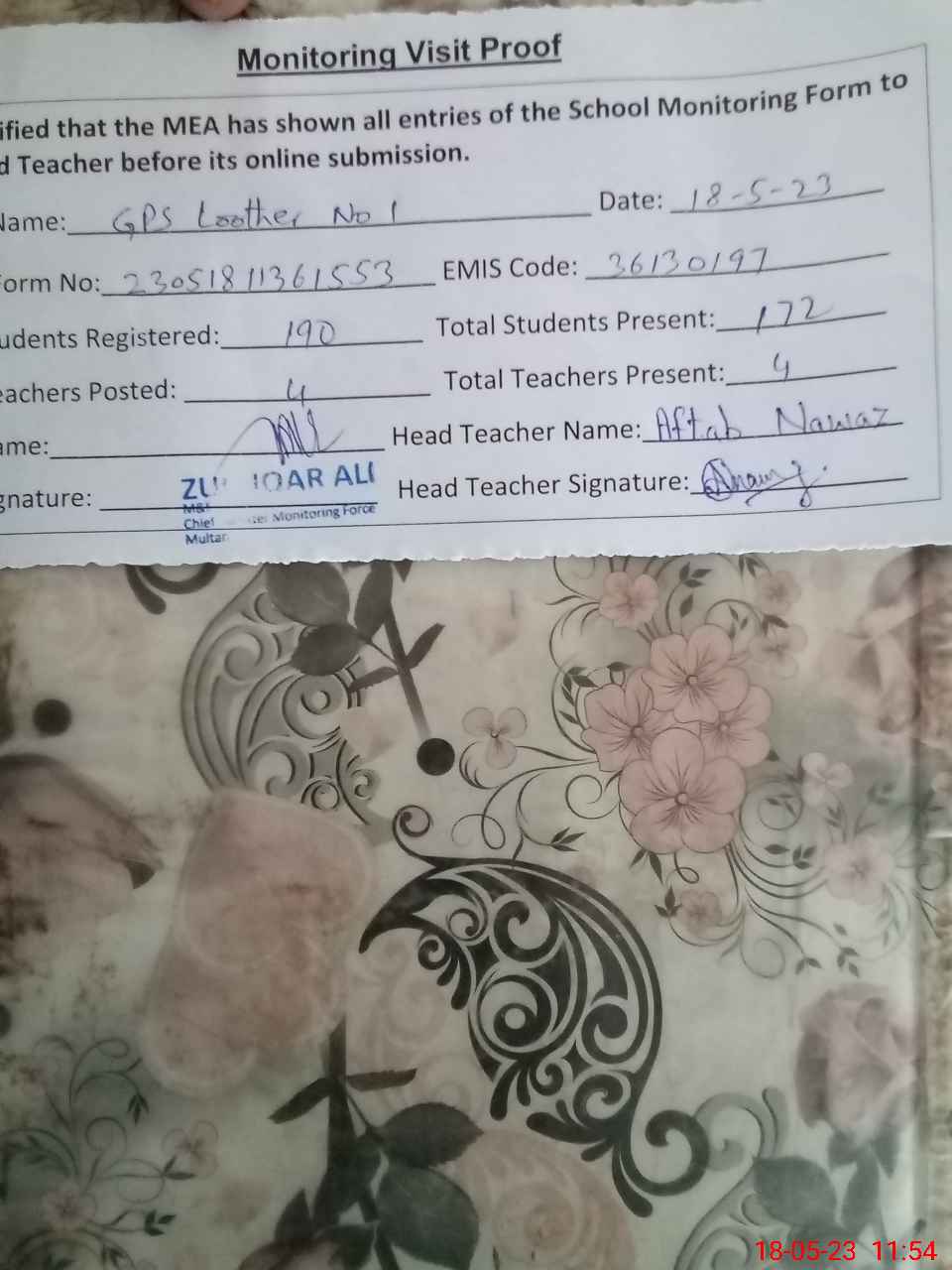 | EMIS Code: 36130197 | Name of School: GPS LOOTHER NO. 1 | |||