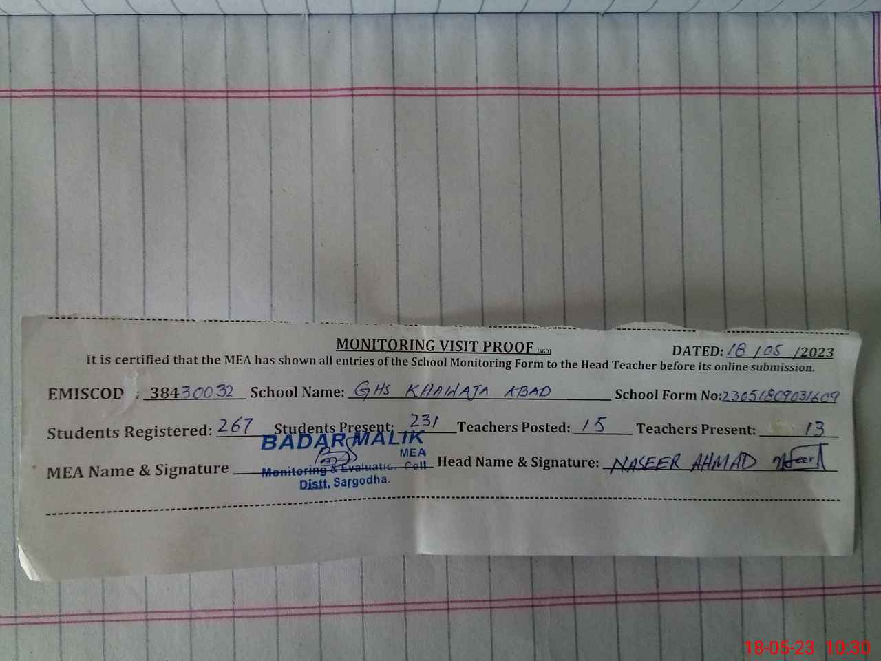 | EMIS Code: 38430032 | Name of School: GHS KHAWAJA ABAD | |||