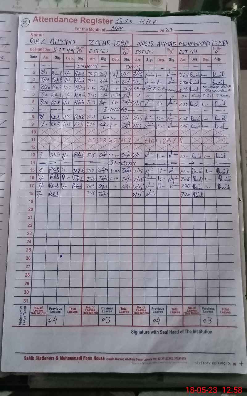 | Name: RI**** AH**** Designation: (School Headmaster's/Headmistress's) SST (GENERAL) Phone/Cell Number: 03**** |