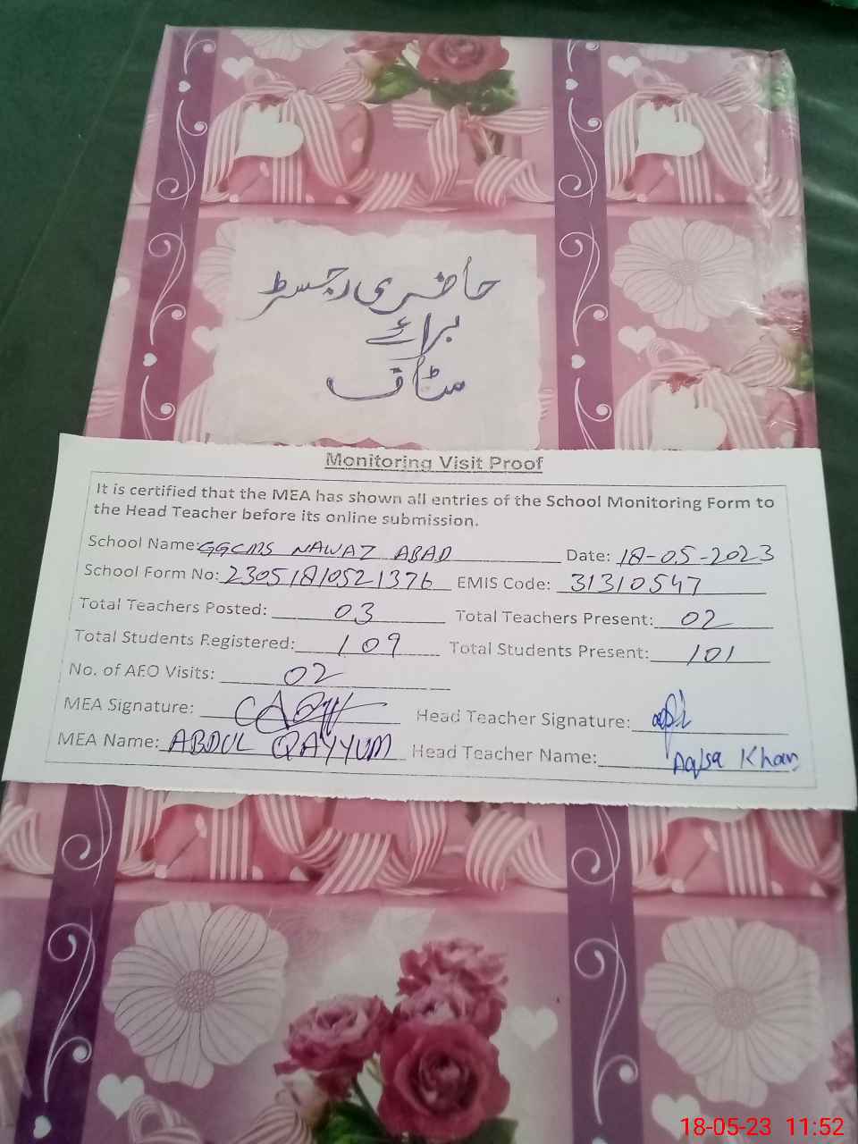 | Attendance Register | Head Teacher | MEA with School | Visit Proof |