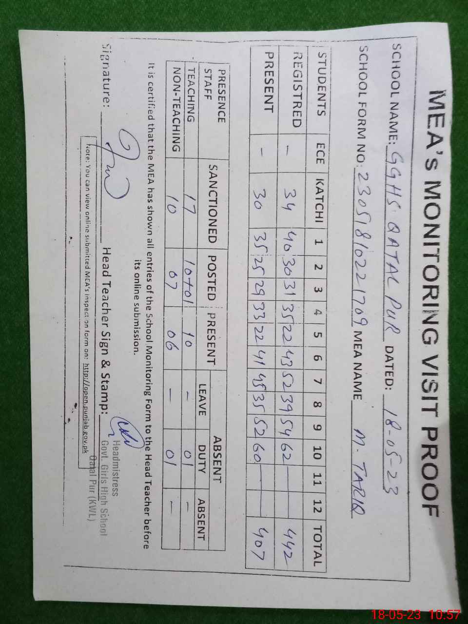 | Attendance Register | Head Teacher | MEA with School | Visit Proof |