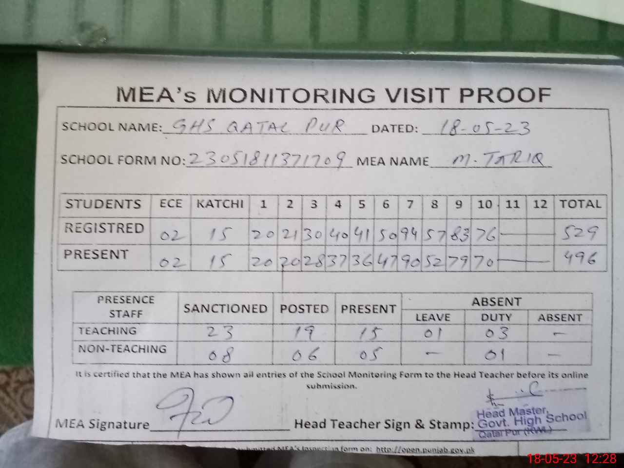 | Attendance Register | Head Teacher | MEA with School | Visit Proof |