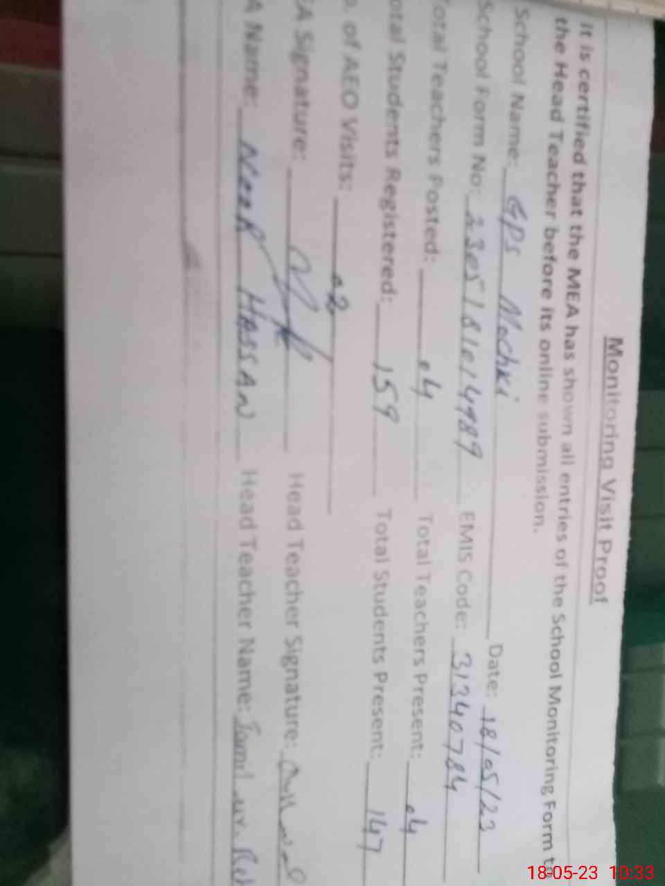 | Attendance Register | Head Teacher | MEA with School | Visit Proof |