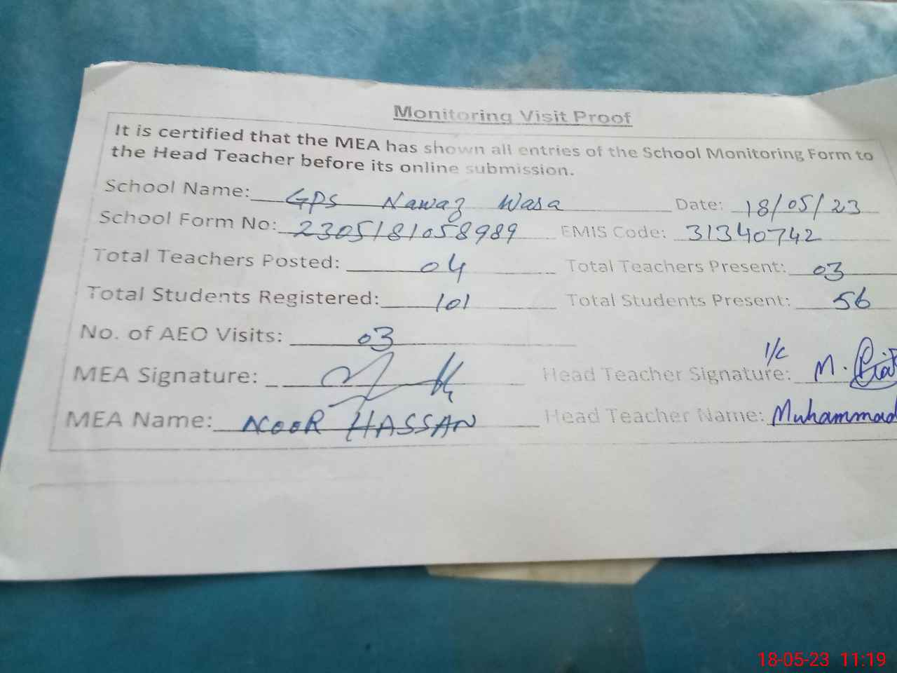 | Attendance Register | Head Teacher | MEA with School | Visit Proof |