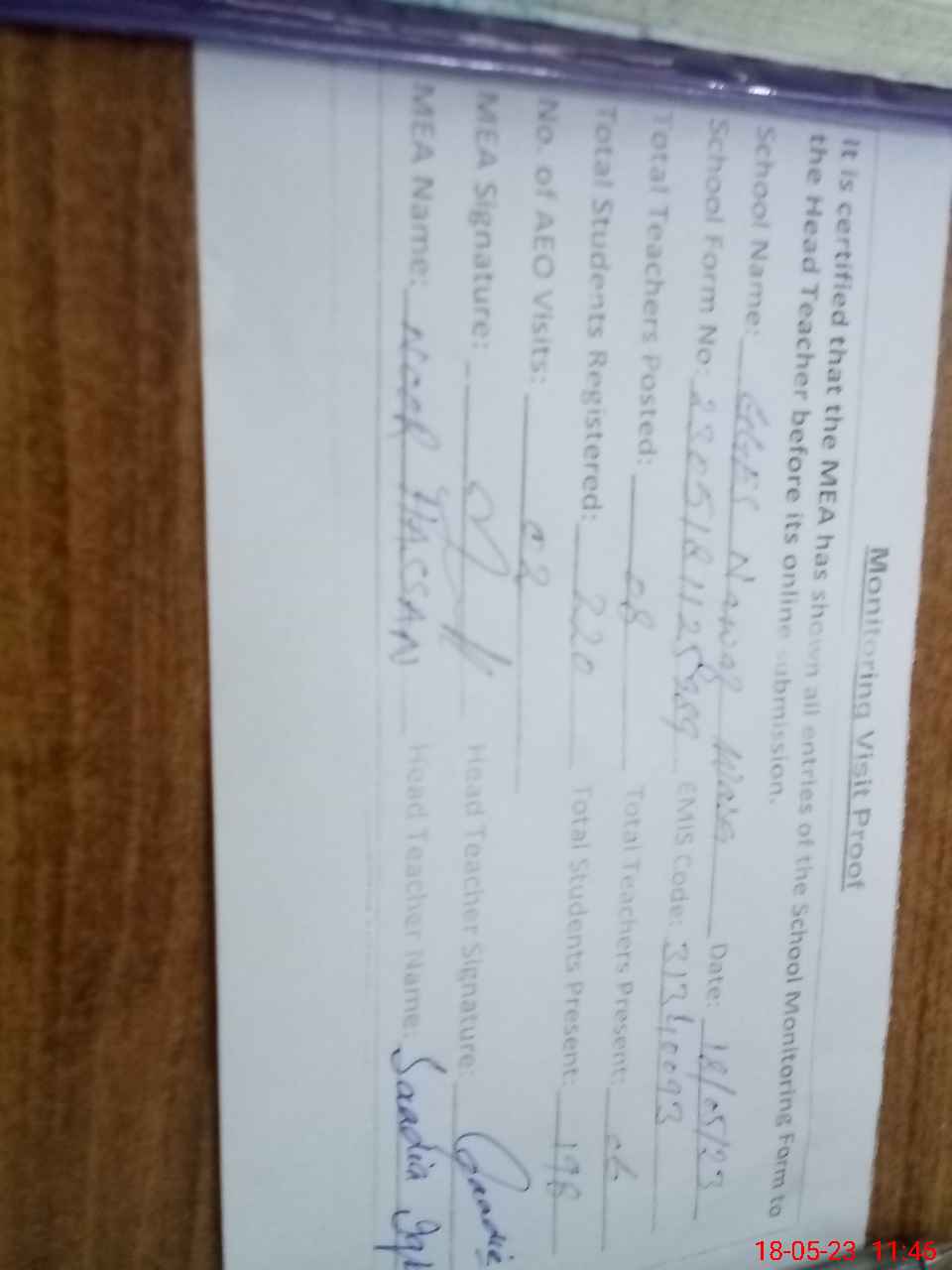 | Attendance Register | Head Teacher | MEA with School | Visit Proof |
