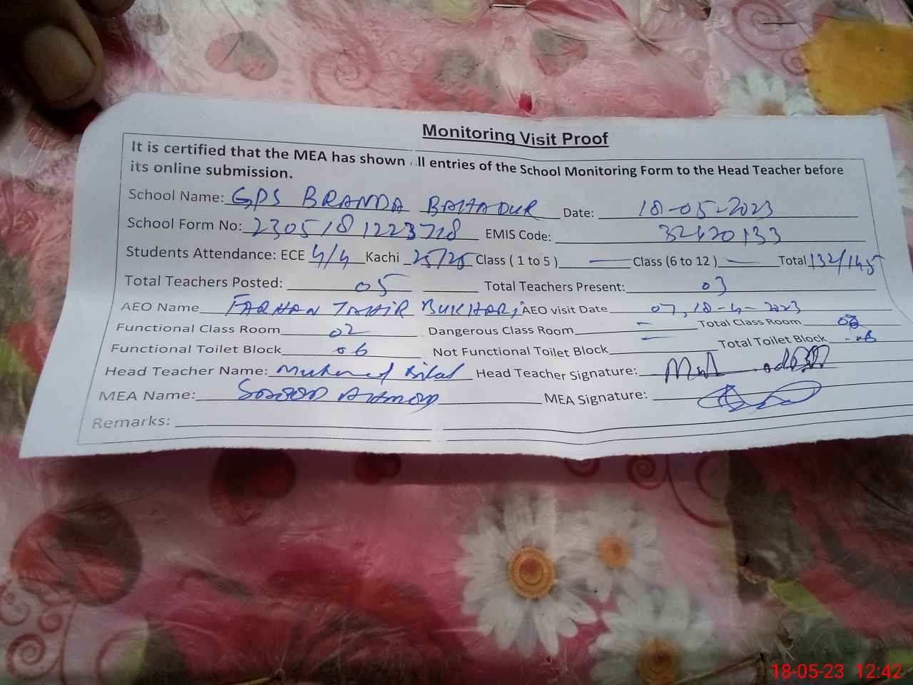 | Attendance Register | Head Teacher | MEA with School | Visit Proof |