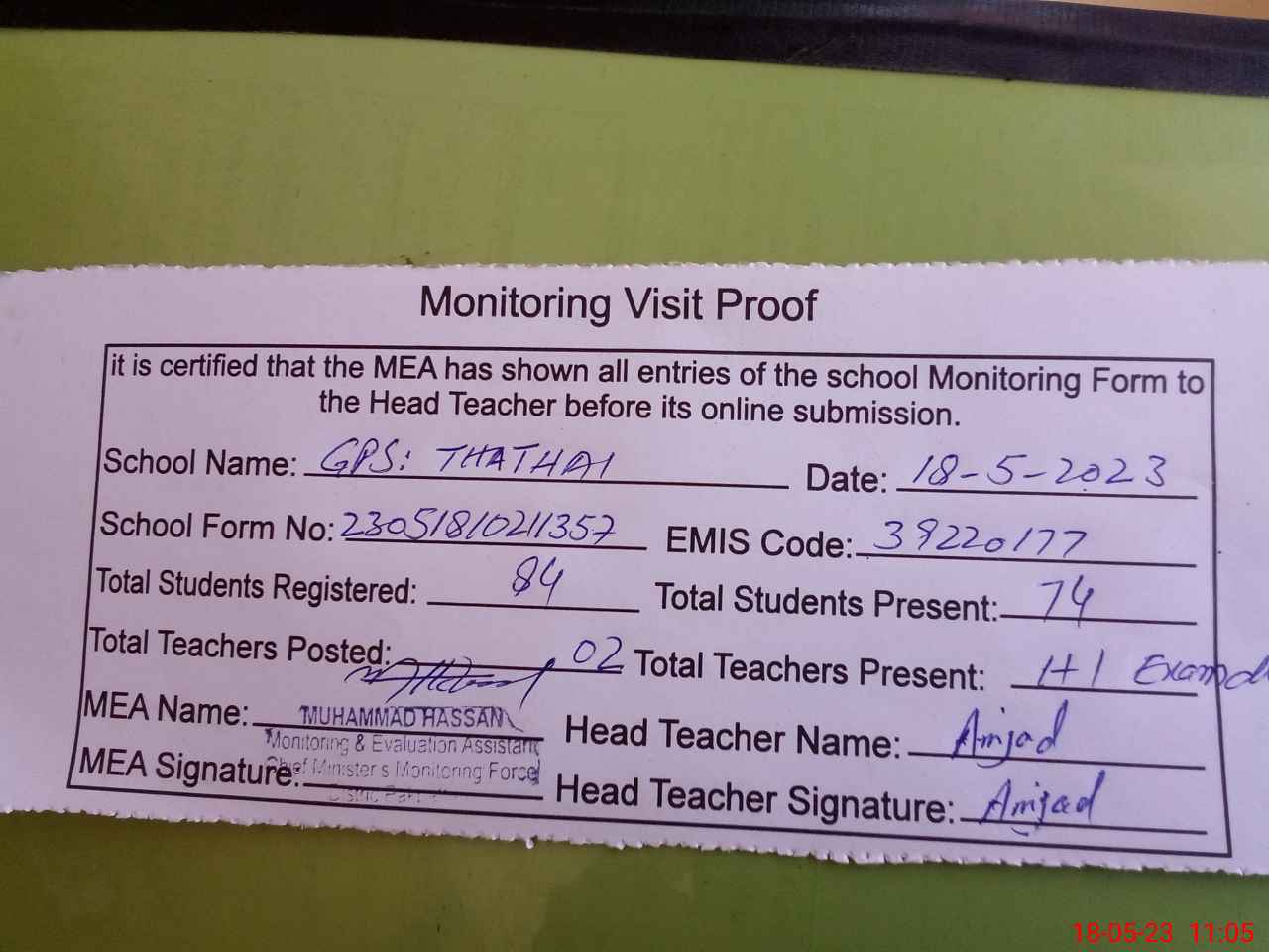 | Attendance Register | Head Teacher | MEA with School | Visit Proof |