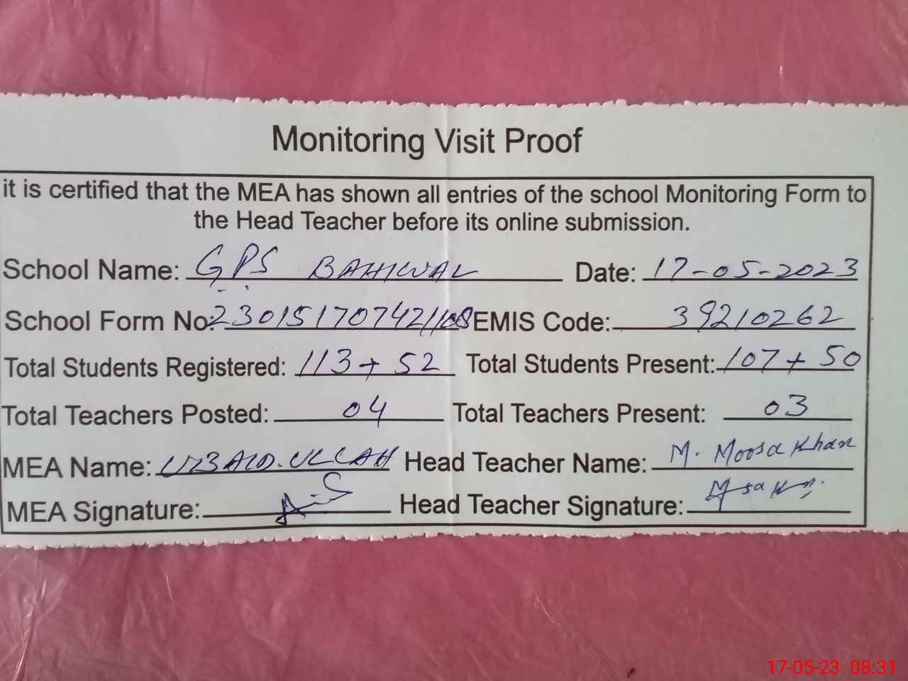| EMIS Code: 39210262 | Name of School: GPS BAHIWAL | |||