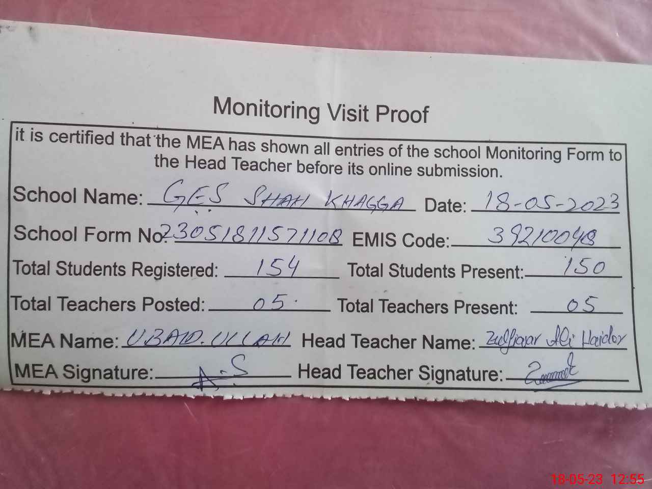 | Attendance Register | Head Teacher | MEA with School | Visit Proof |