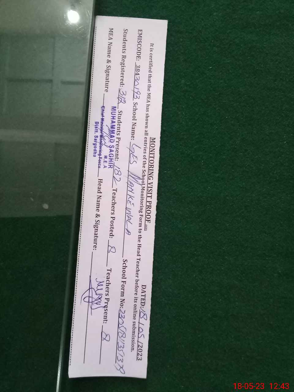 | Certified that this School was Inspected by the Undersigned MEA/DMO Today and the Information Stated Above is as Per Record. | |||||