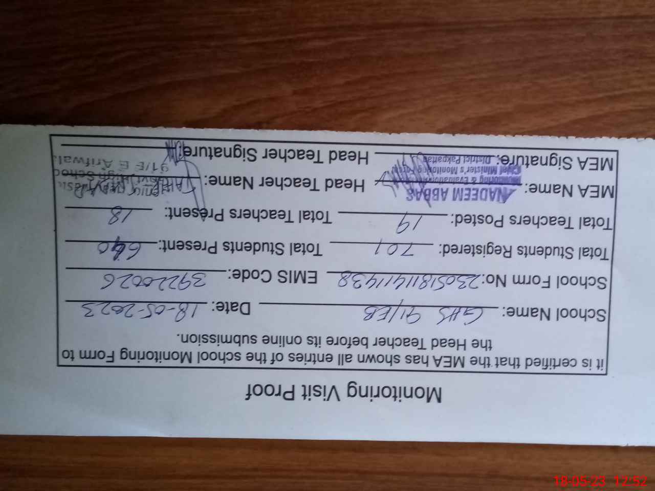 | Certified that this School was Inspected by the Undersigned MEA/DMO Today and the Information Stated Above is as Per Record. | |||||