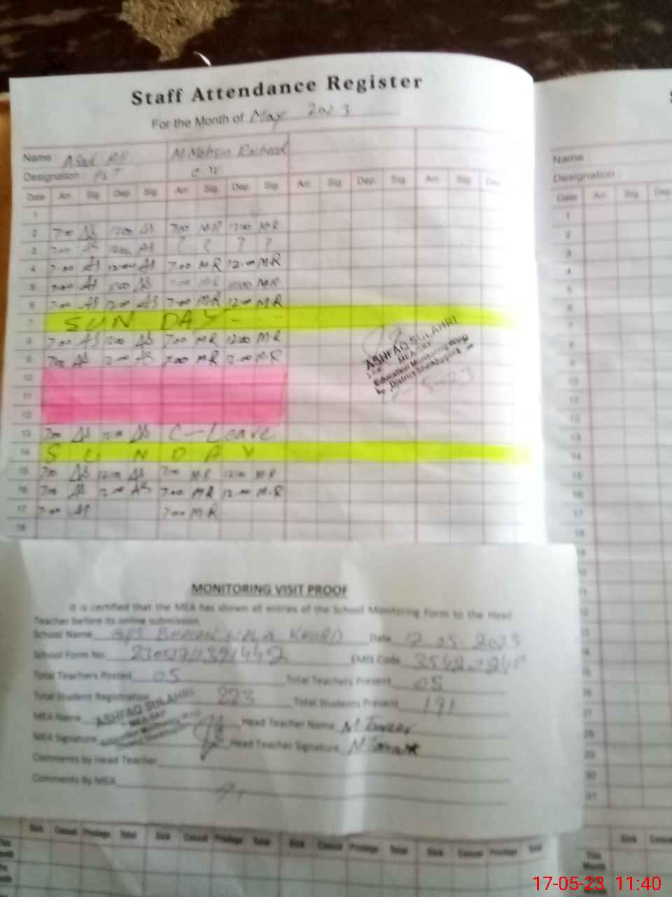 | Attendance Register | Head Teacher | MEA with School | Visit Proof |