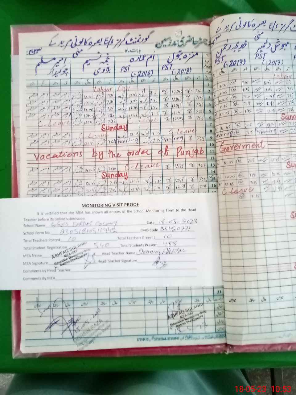 | Attendance Register | Head Teacher | MEA with School | Visit Proof |