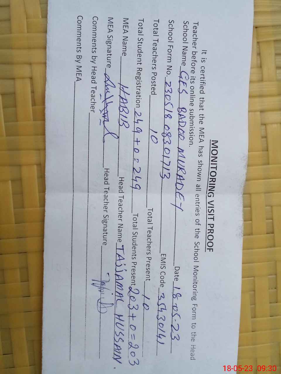 | Attendance Register | Head Teacher | MEA with School | Visit Proof |