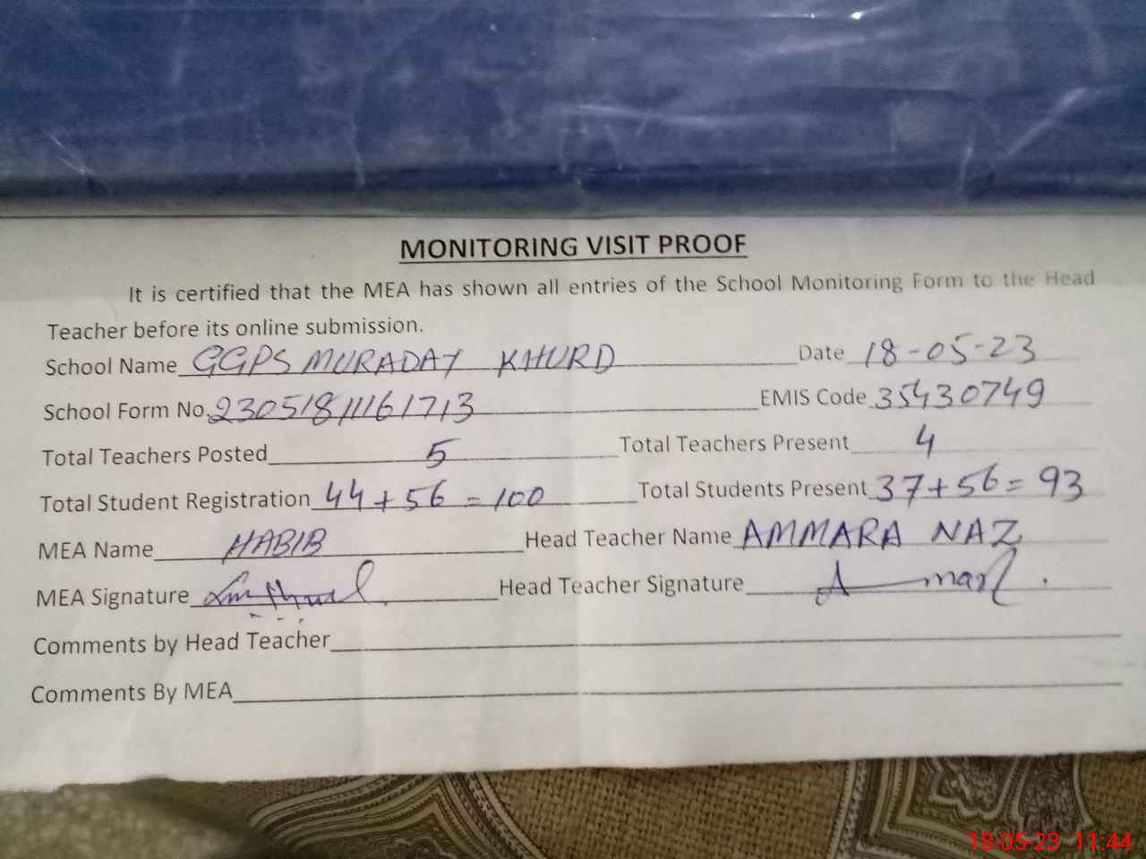 | Attendance Register | Head Teacher | MEA with School | Visit Proof |