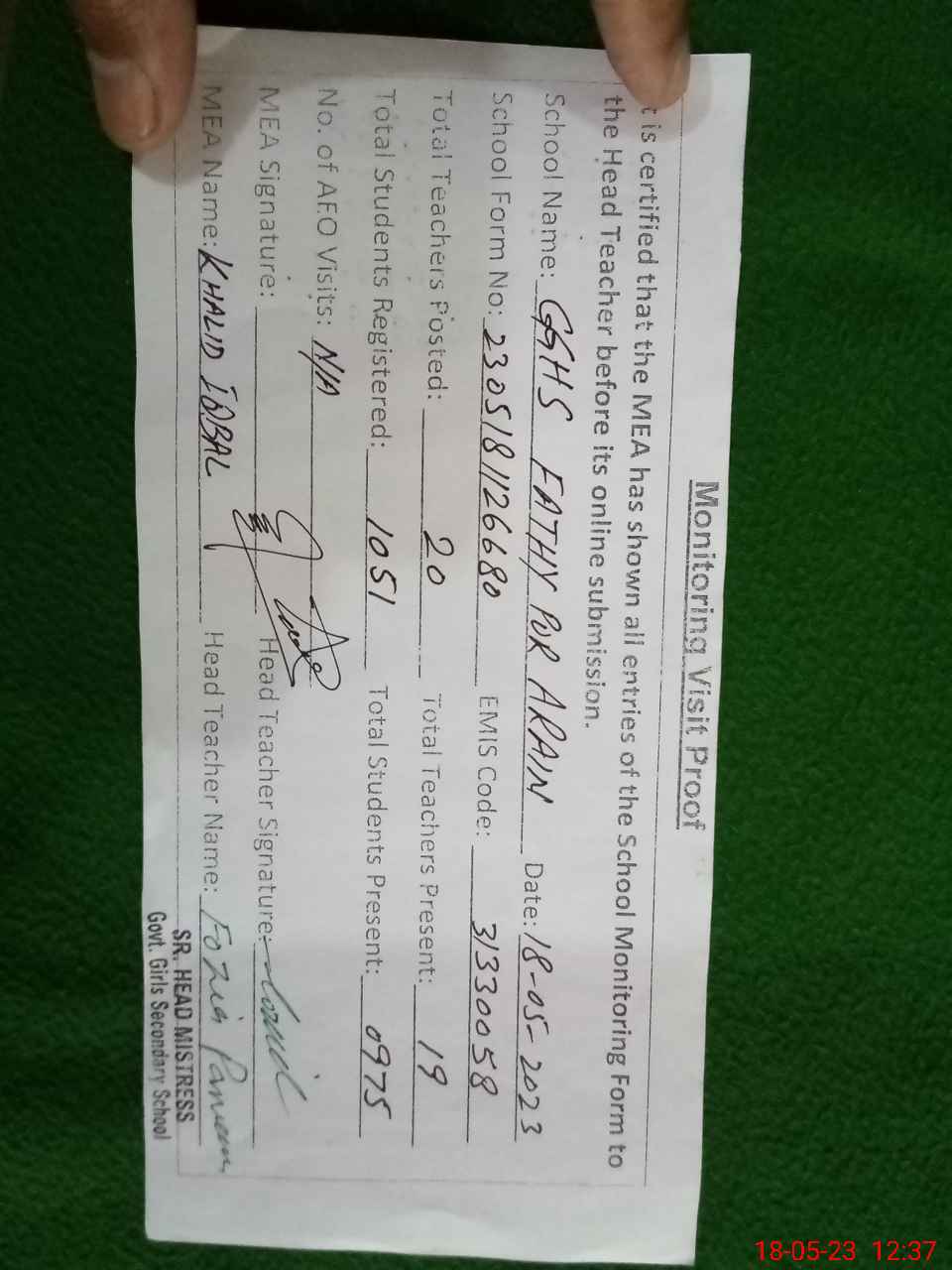 | Attendance Register | Head Teacher | MEA with School | Visit Proof |