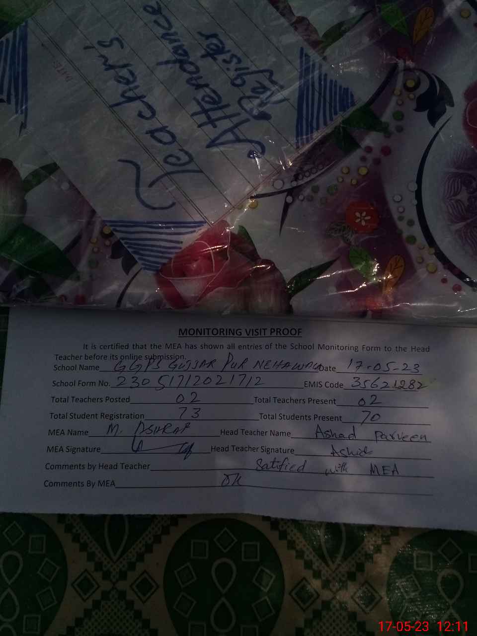 | Attendance Register | Head Teacher | MEA with School | Visit Proof |