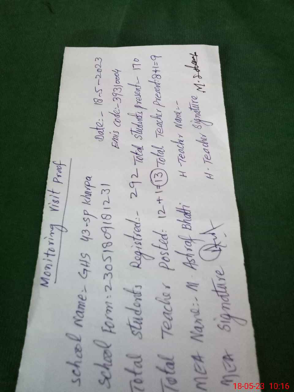 | Attendance Register | Head Teacher | MEA with School | Visit Proof |