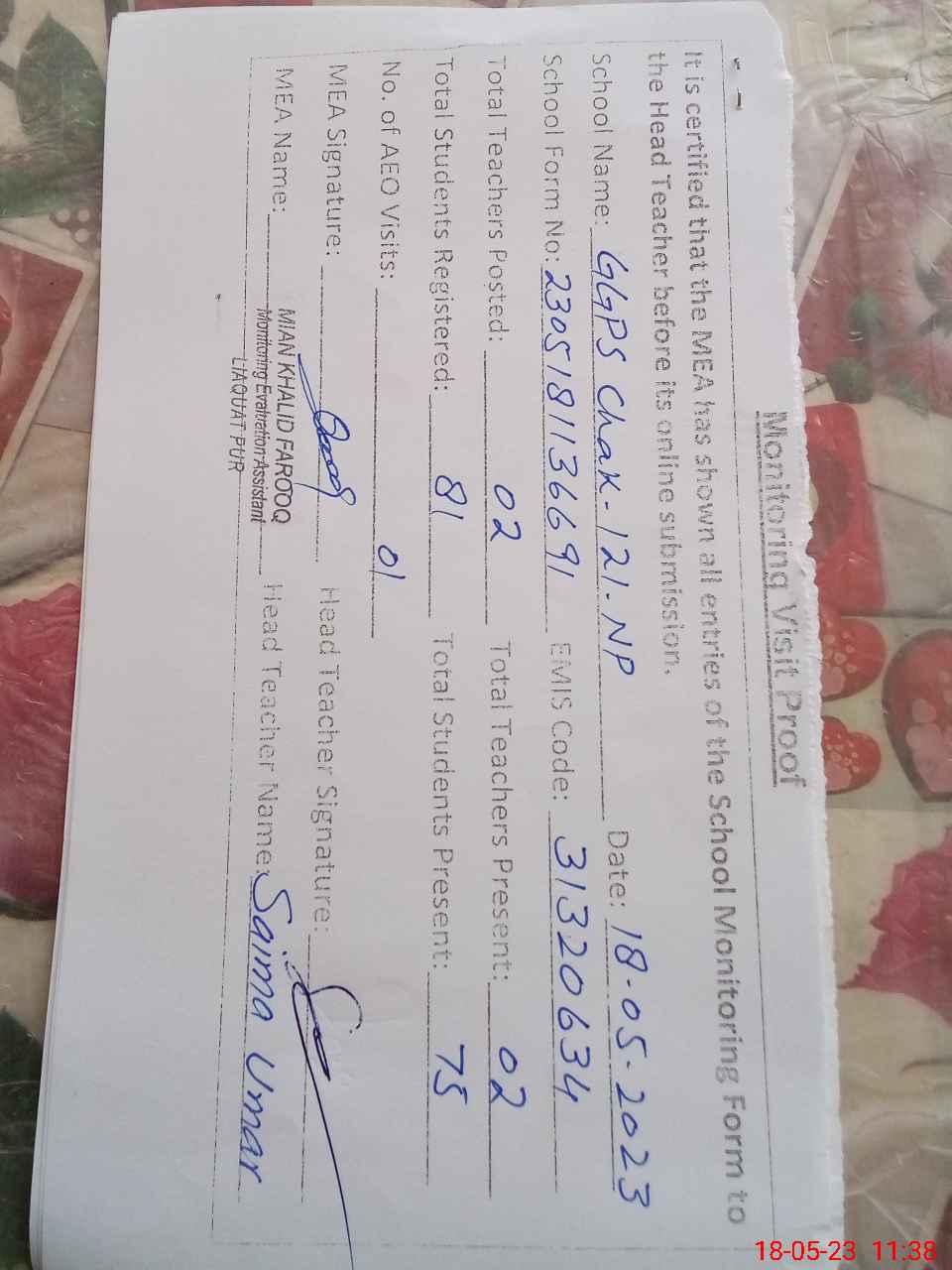 | Attendance Register | Head Teacher | MEA with School | Visit Proof |