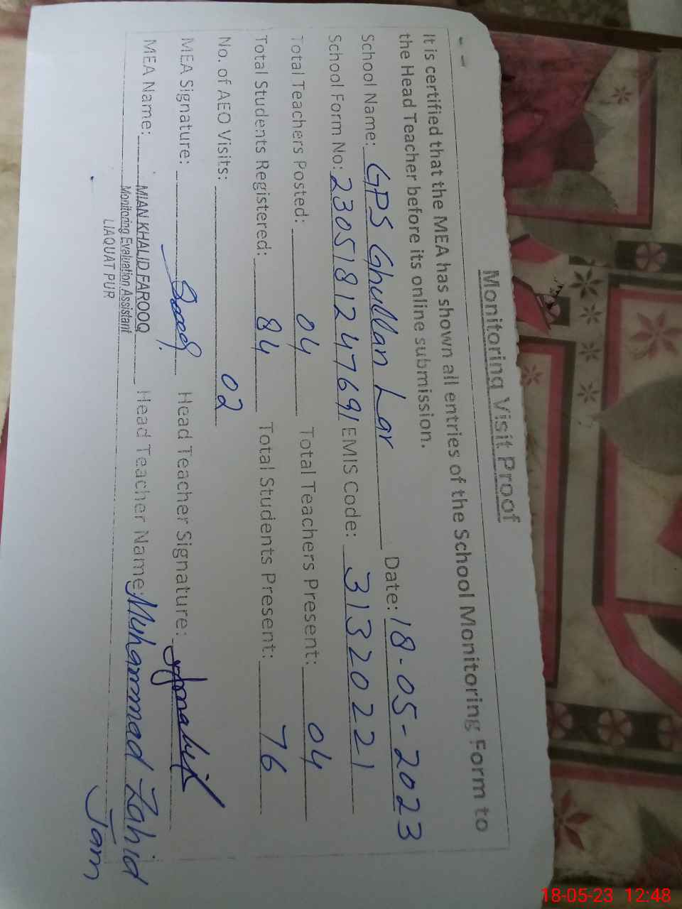 | Attendance Register | Head Teacher | MEA with School | Visit Proof |