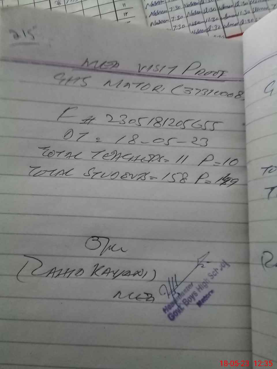 | Attendance Register | Head Teacher | MEA with School | Visit Proof |