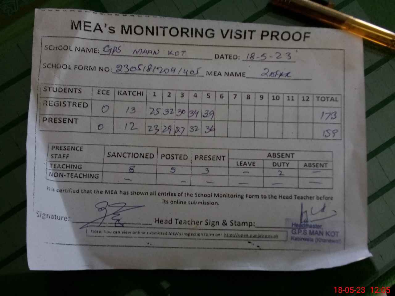 | Attendance Register | Head Teacher | MEA with School | Visit Proof |