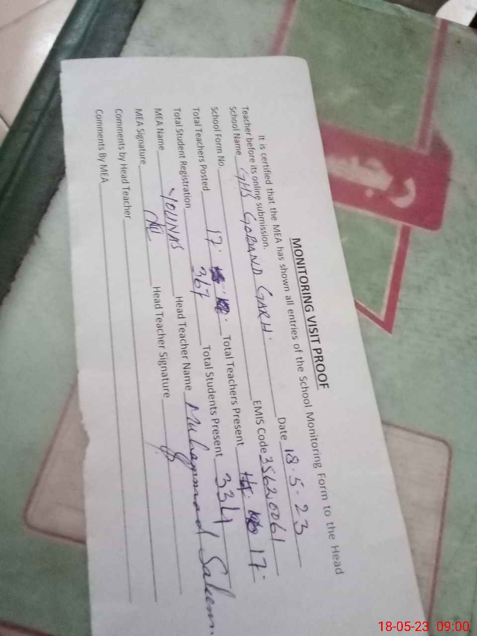 | Attendance Register | Head Teacher | MEA with School | Visit Proof |