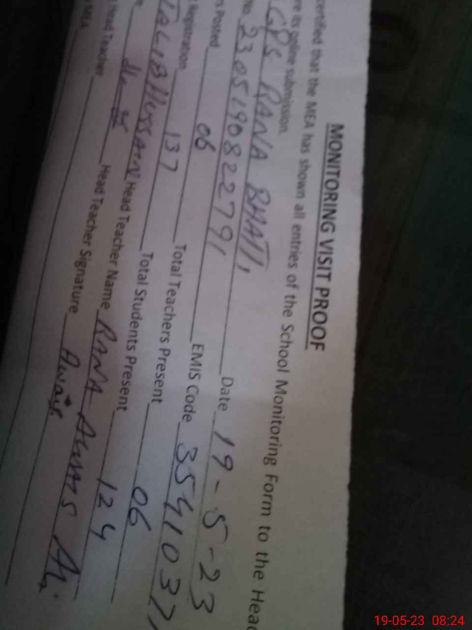 | Name: MAw**** Designation: (School Headmaster's/Headmistress's) PST Phone/Cell Number: 03**** |