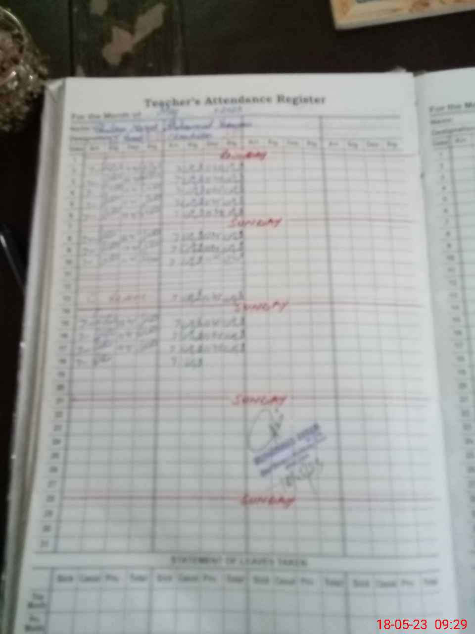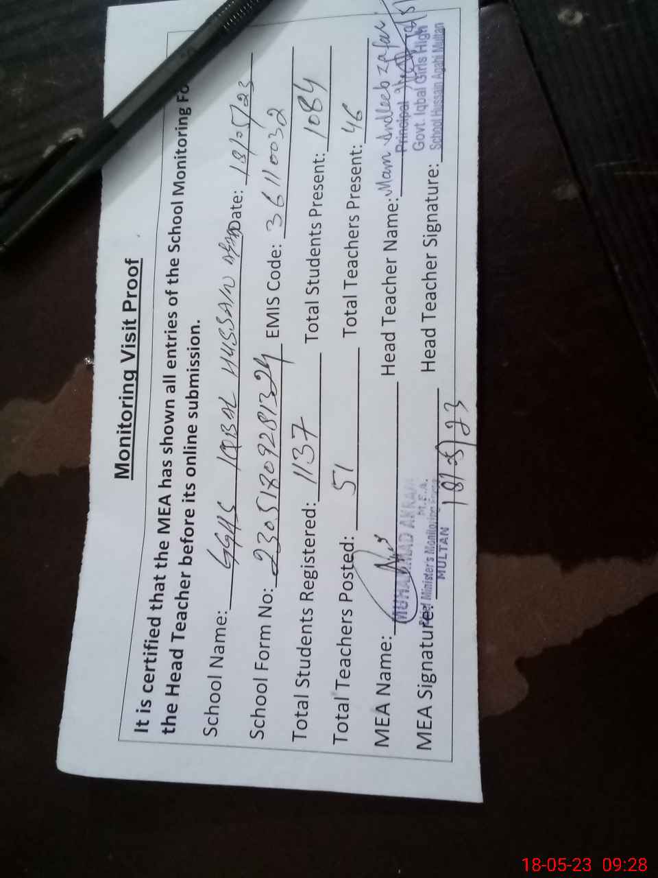 | Attendance Register | Head Teacher | MEA with School | Visit Proof |