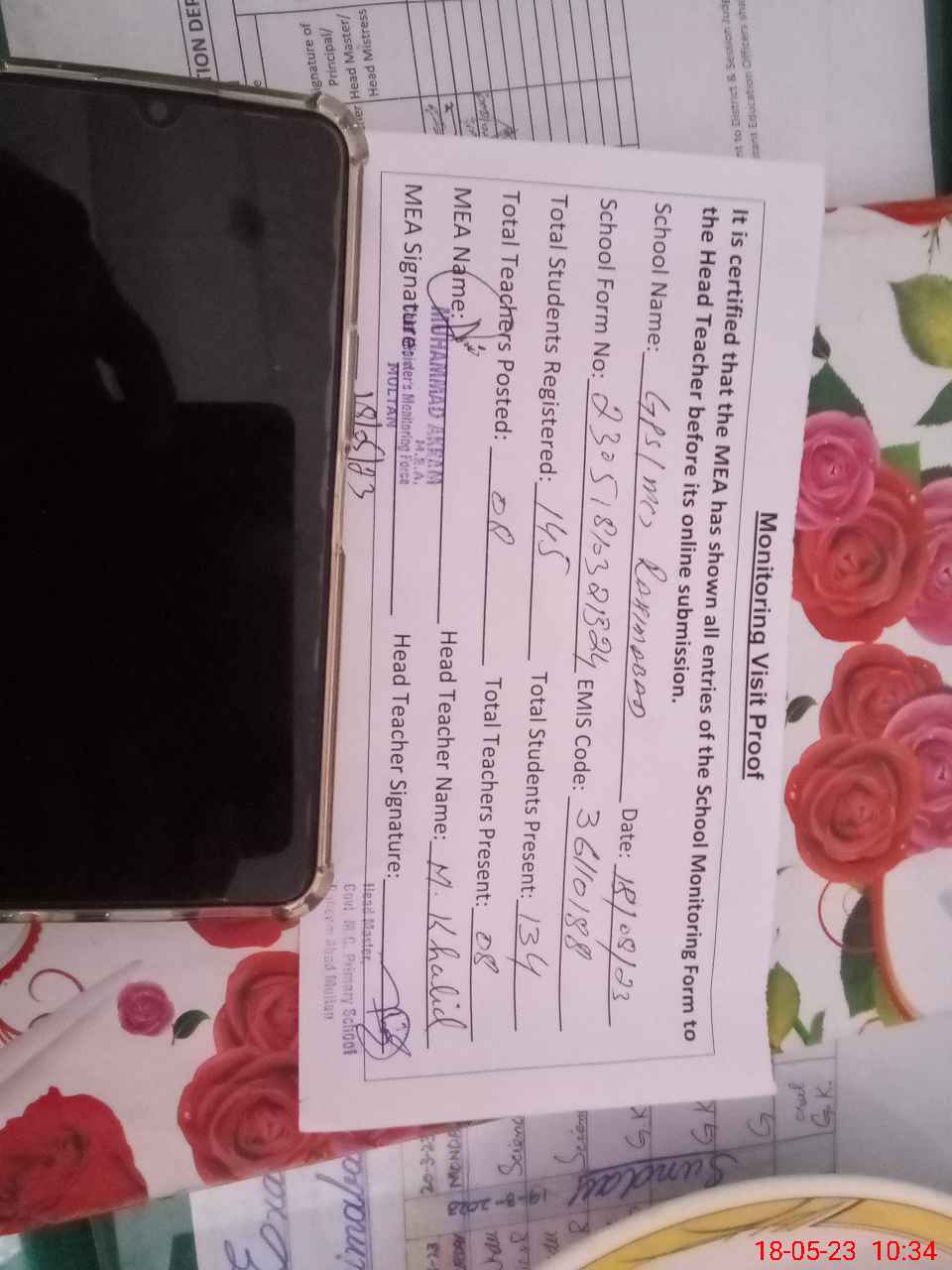 | Attendance Register | Head Teacher | MEA with School | Visit Proof |
