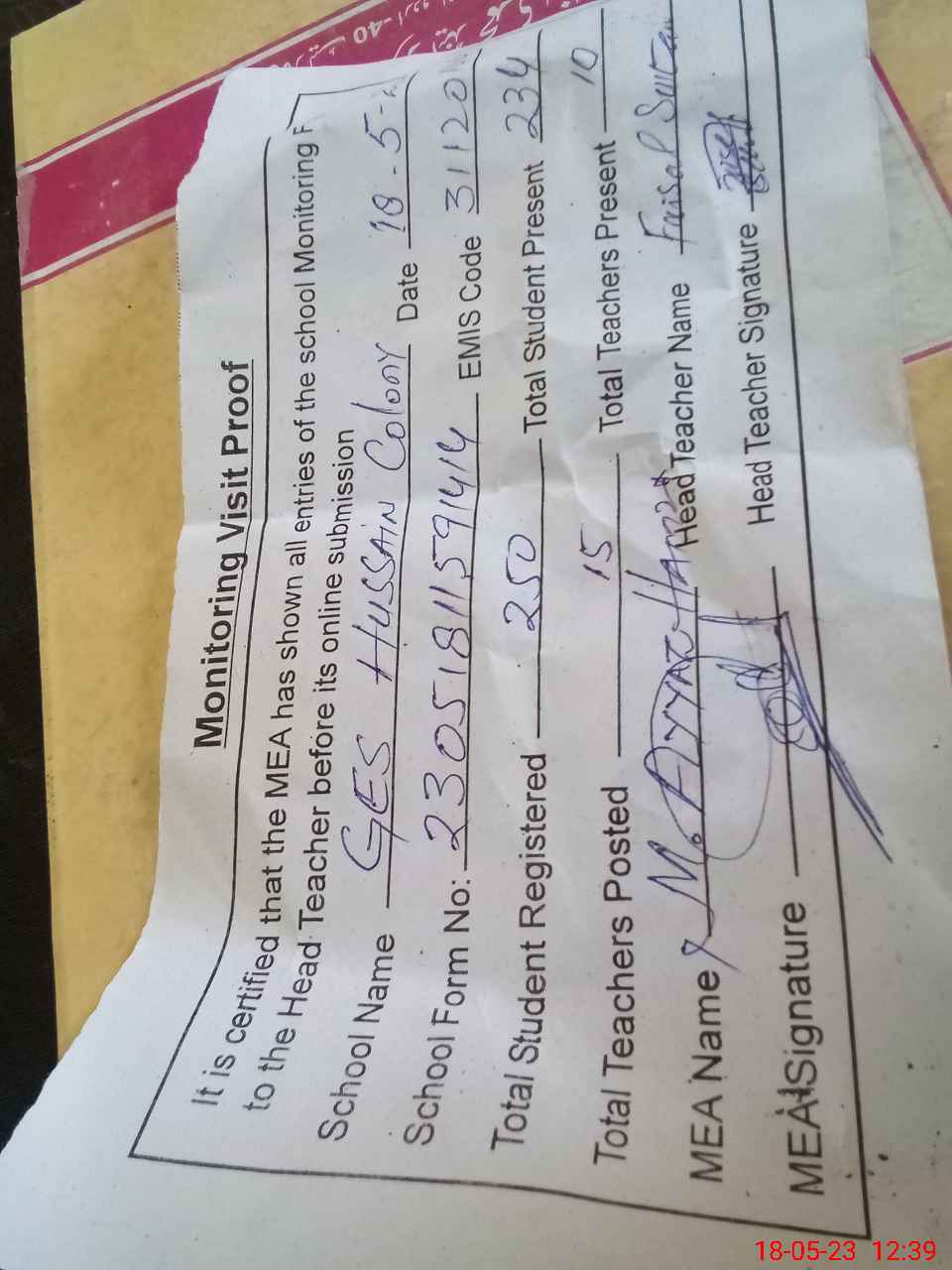| Attendance Register | Head Teacher | MEA with School | Visit Proof |