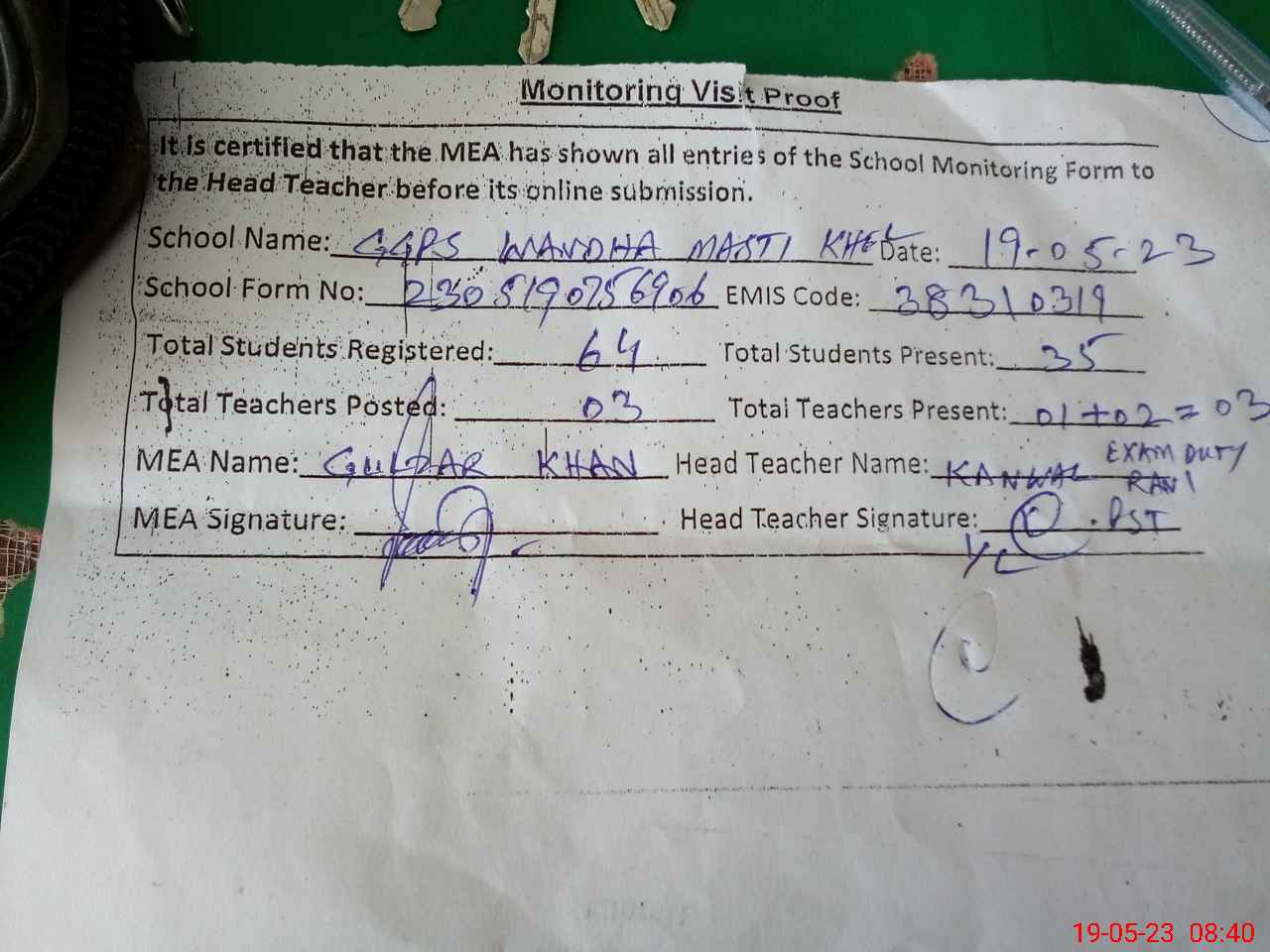 | Attendance Register | Head Teacher | MEA with School | Visit Proof |