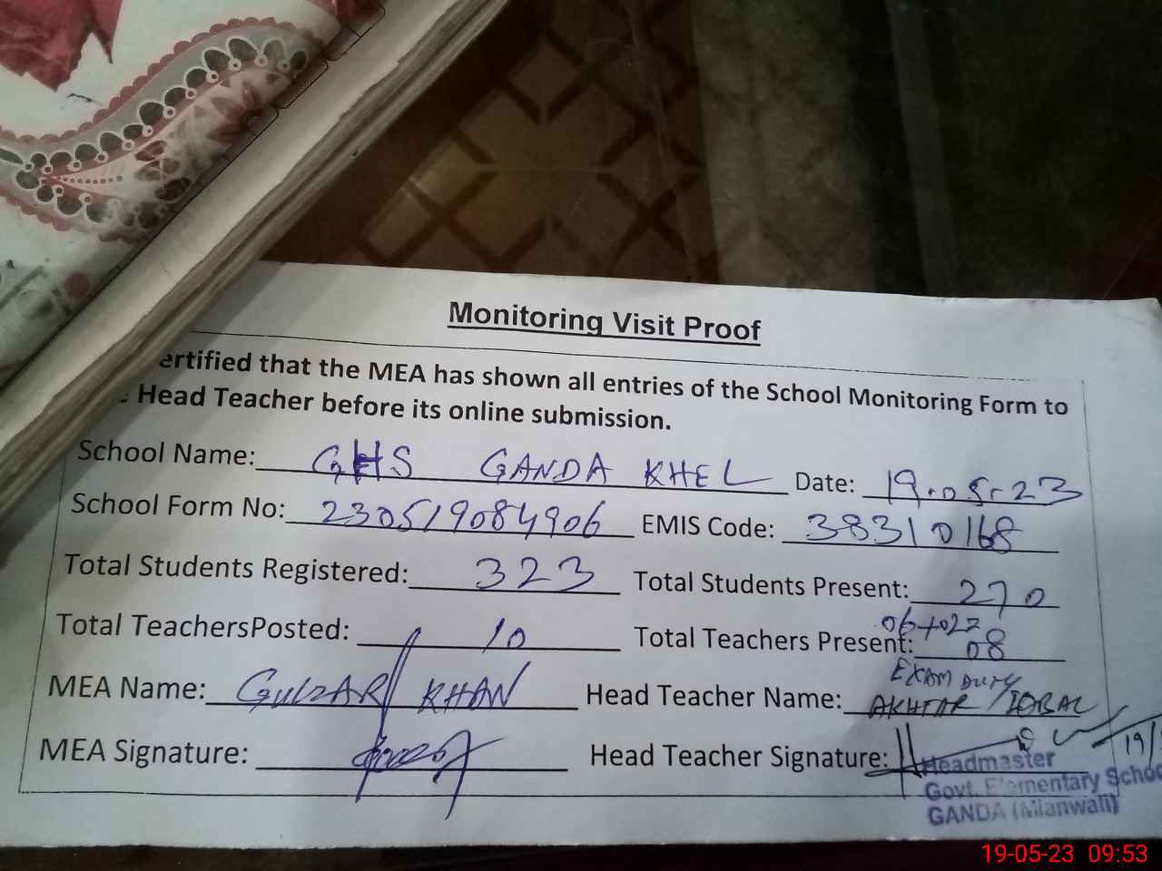 | Attendance Register | Head Teacher | MEA with School | Visit Proof |