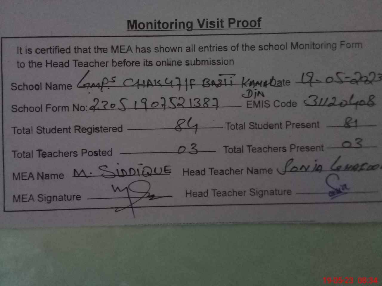 | Attendance Register | Head Teacher | MEA with School | Visit Proof |