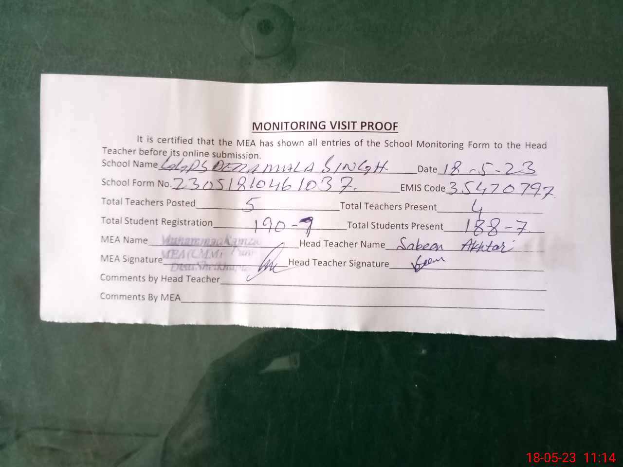 | Attendance Register | Head Teacher | MEA with School | Visit Proof |