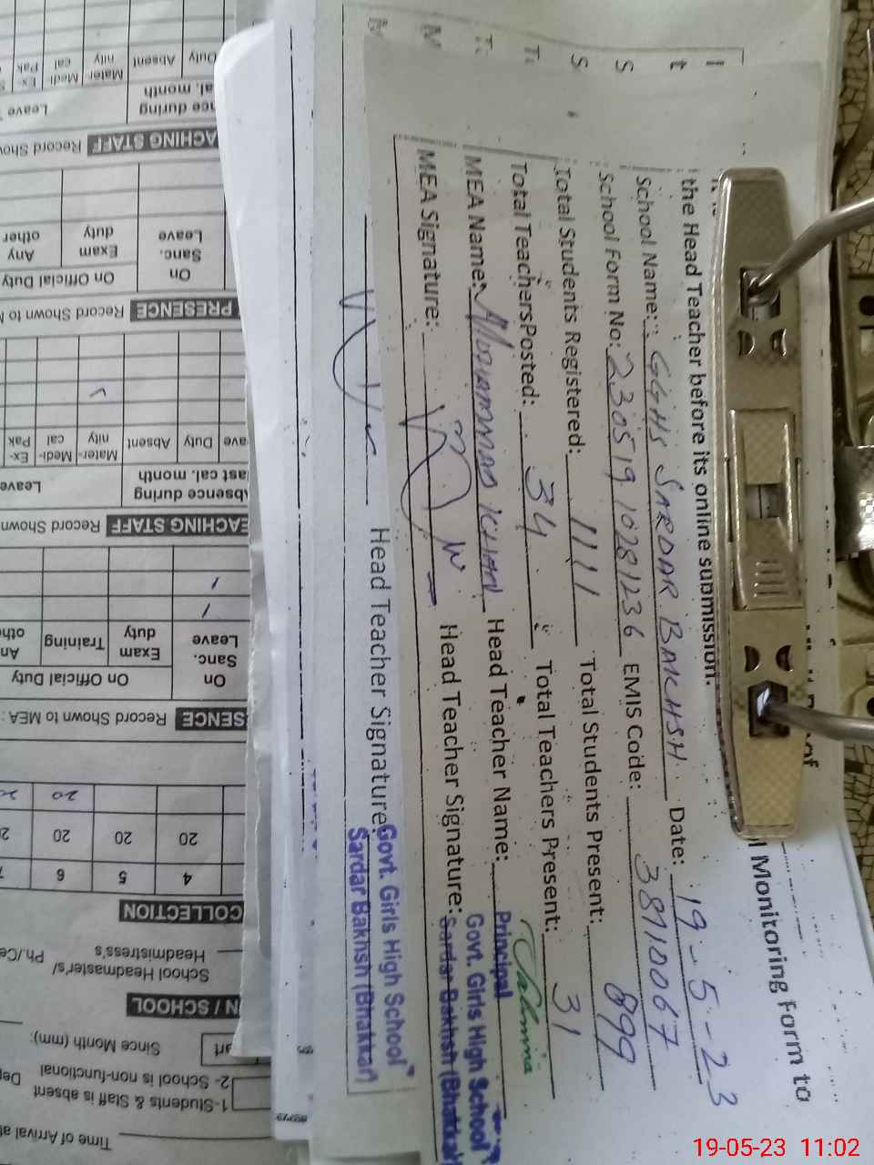 | Attendance Register | Head Teacher | MEA with School | Visit Proof |