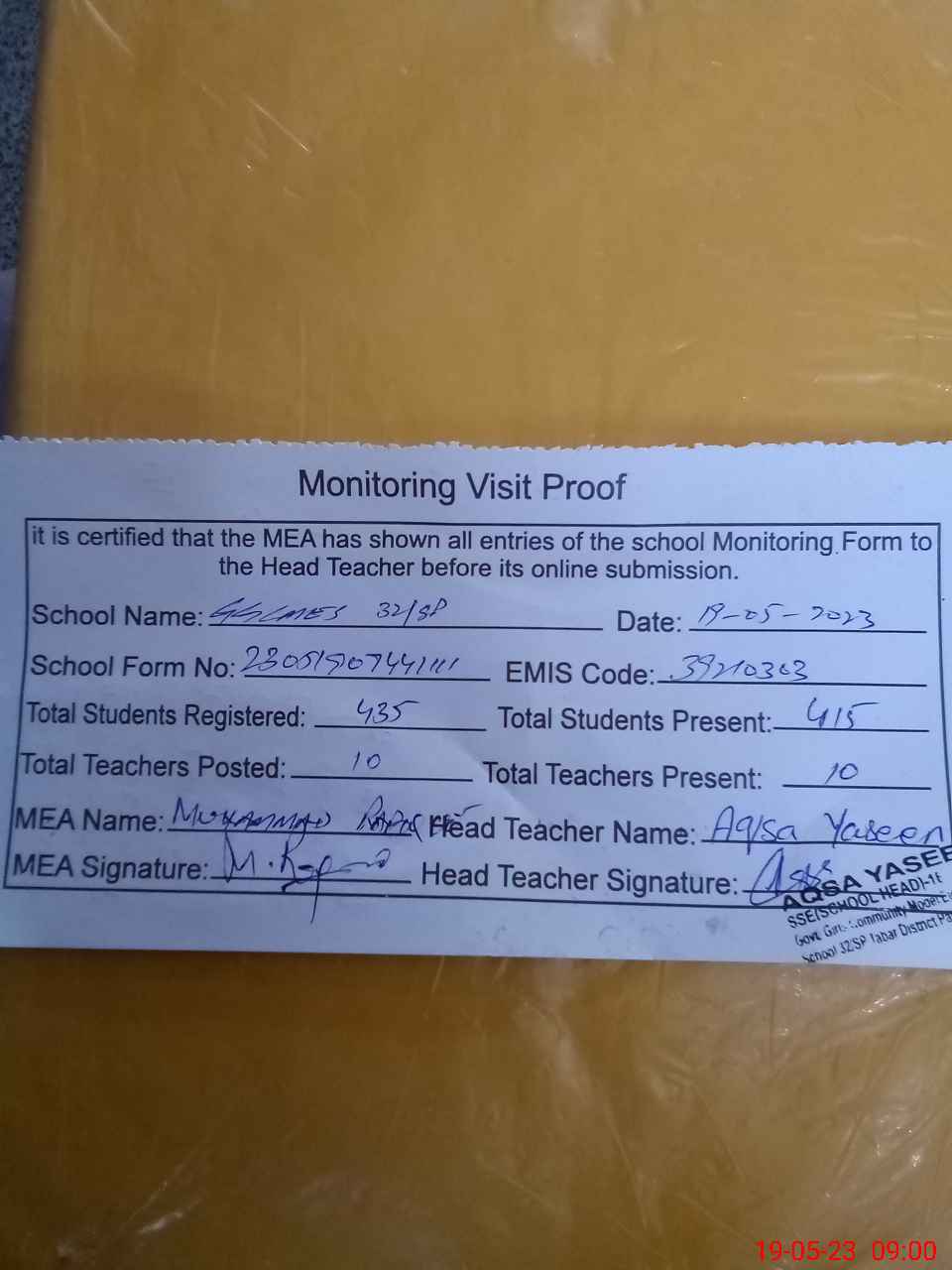| Attendance Register | Head Teacher | MEA with School | Visit Proof |