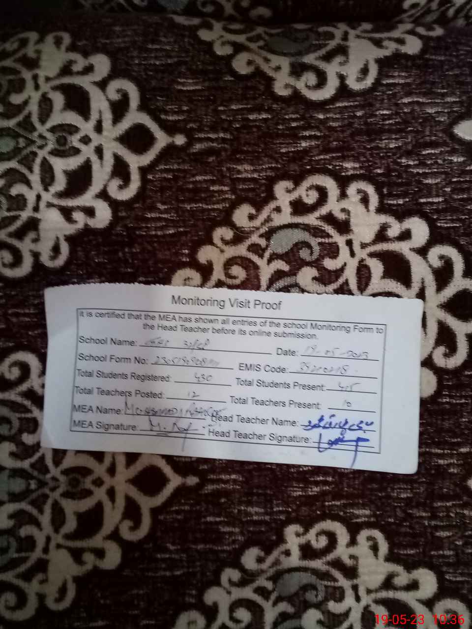 | Attendance Register | Head Teacher | MEA with School | Visit Proof |