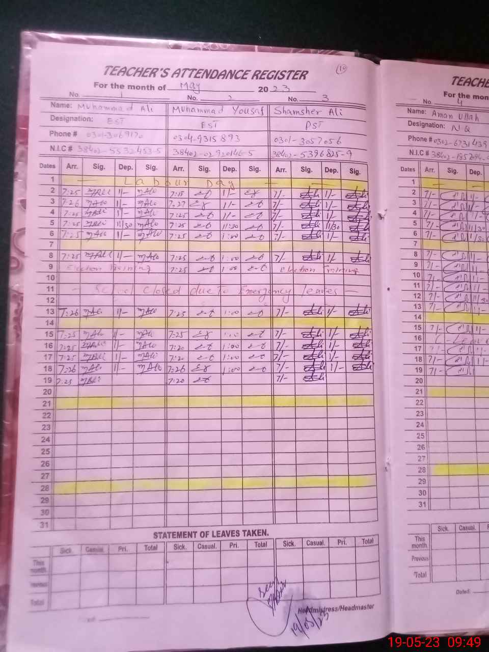 | Name: MU**** AL**** Designation: (School Headmaster's/Headmistress's) EST (GENRAL) Phone/Cell Number: 03**** |