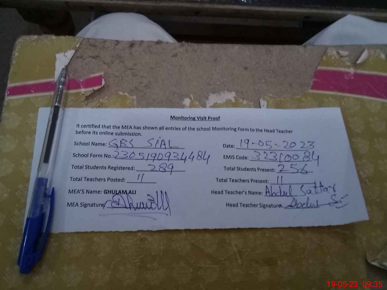 | Attendance Register | Head Teacher | MEA with School | Visit Proof |