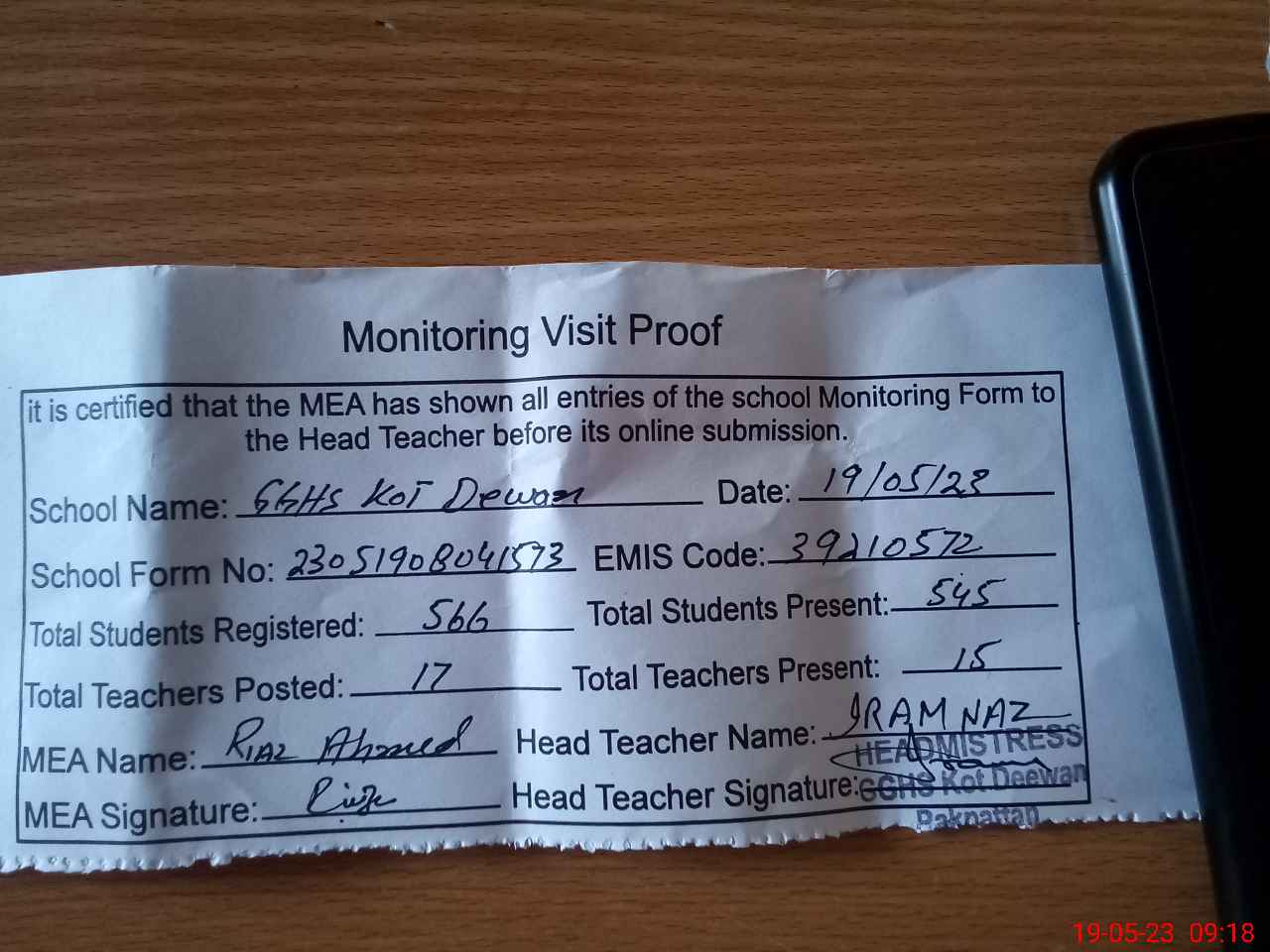 | Attendance Register | Head Teacher | MEA with School | Visit Proof |