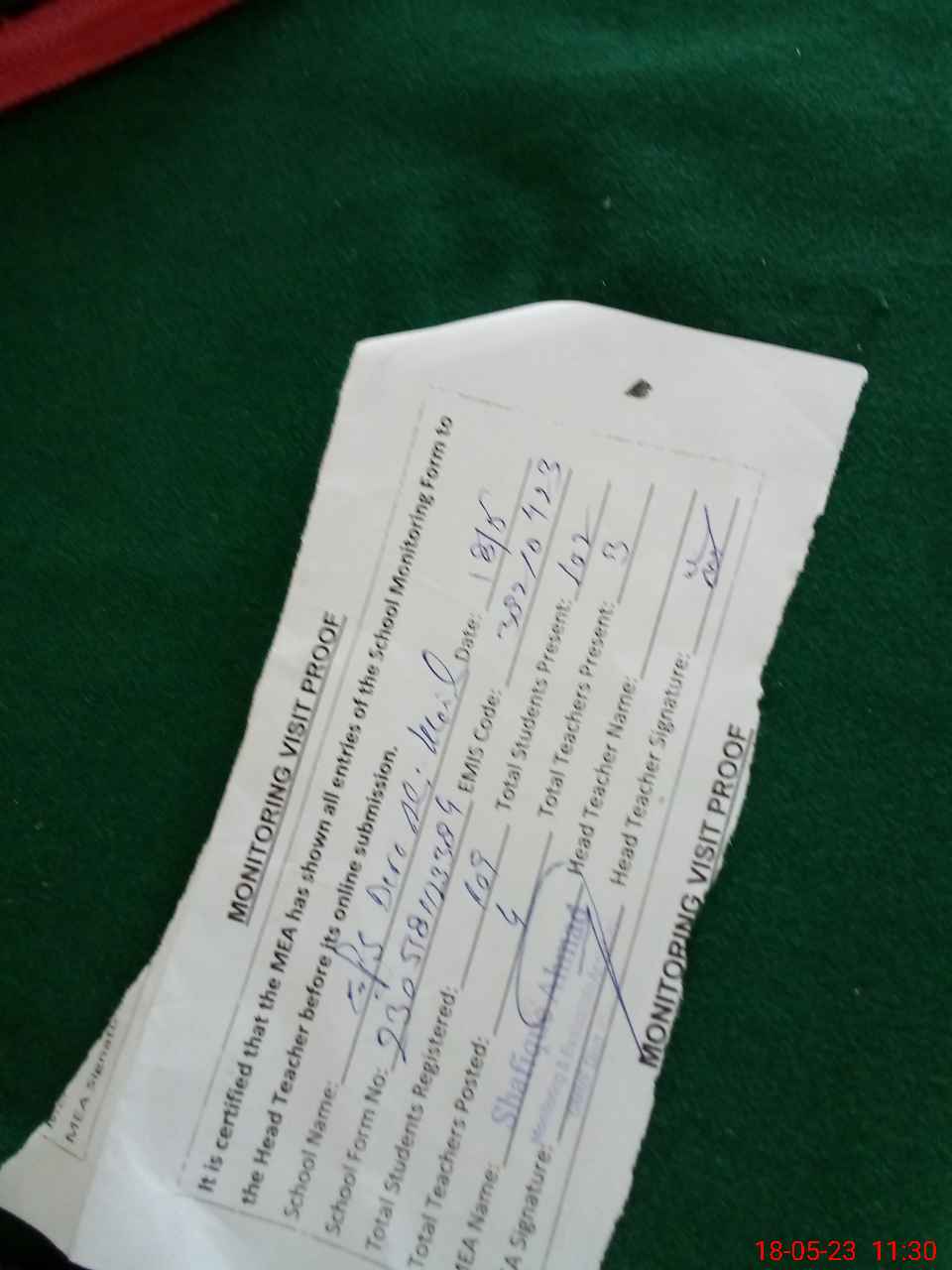 | Attendance Register | Head Teacher | MEA with School | Visit Proof |