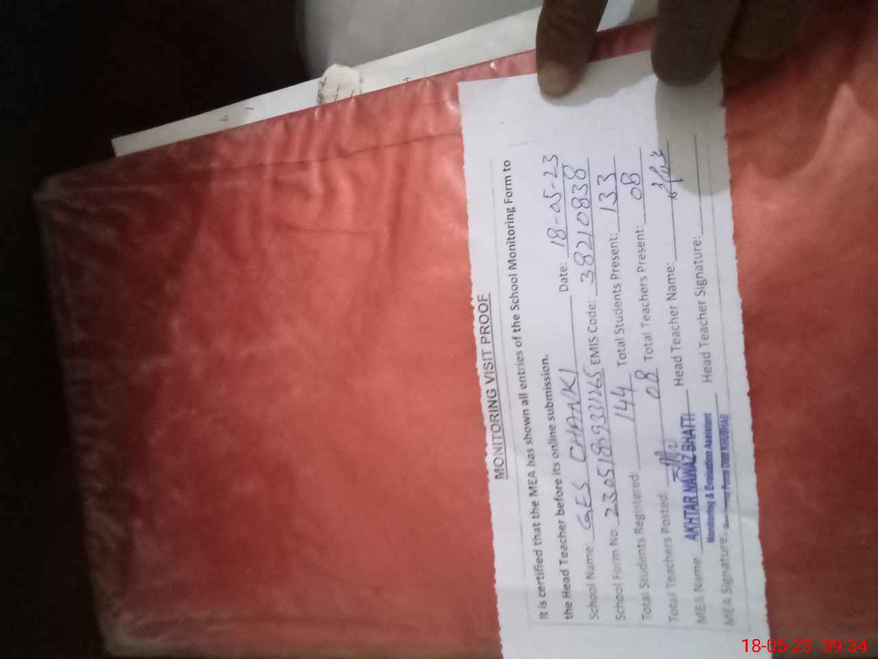 | Attendance Register | Head Teacher | MEA with School | Visit Proof |