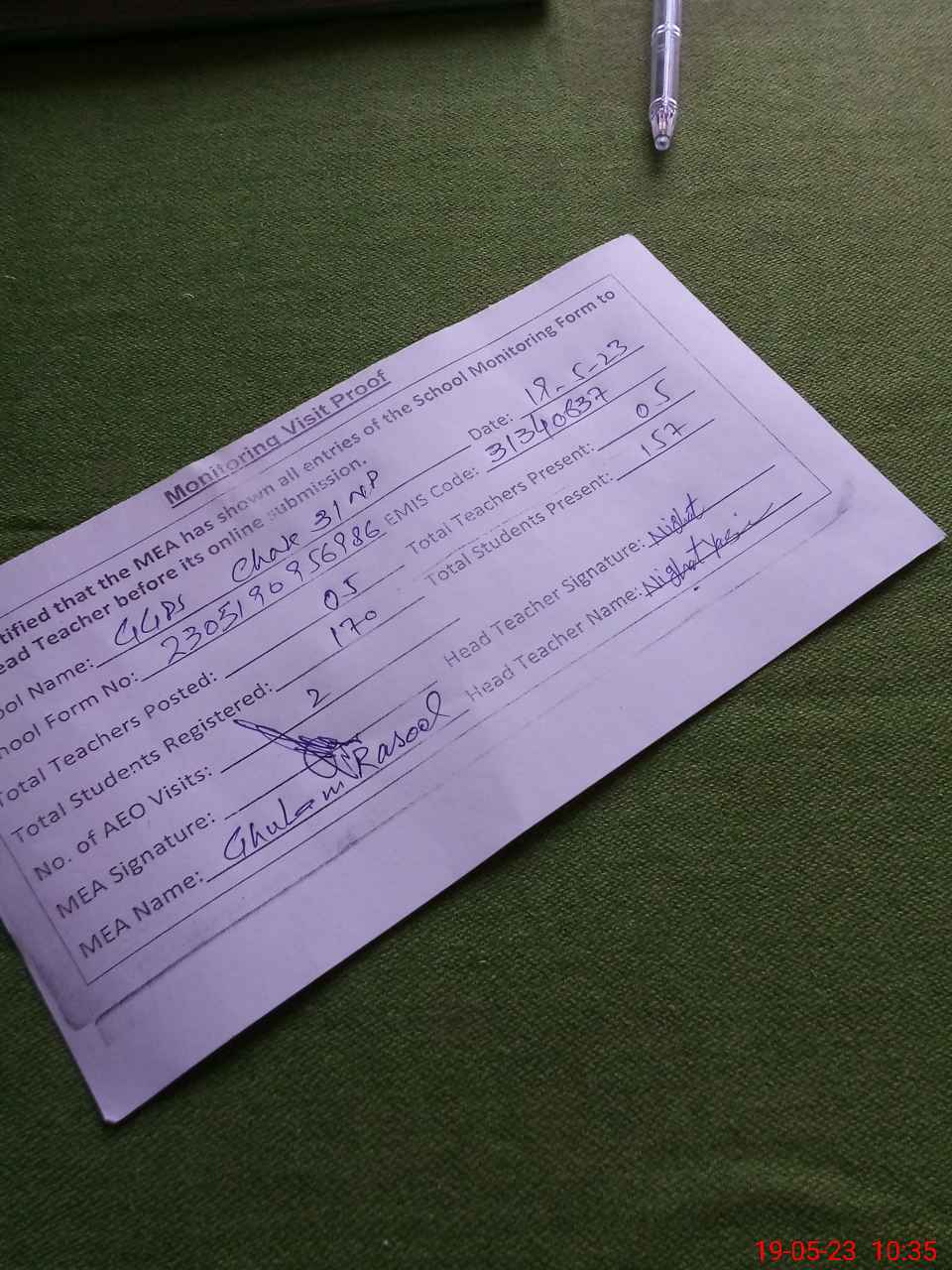 | Attendance Register | Head Teacher | MEA with School | Visit Proof |