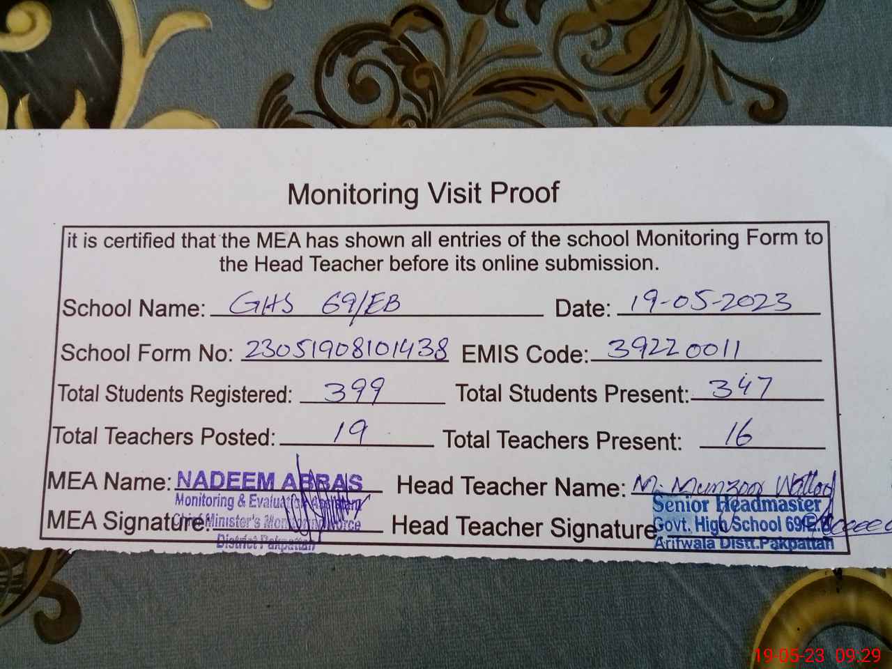 | EMIS Code: 39220011 | Name of School: GHS 69/EB ARIF WALA | |||