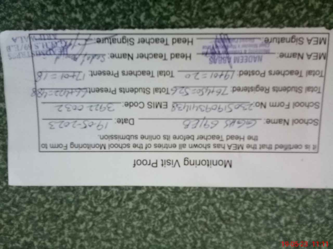 | Certified that this School was Inspected by the Undersigned MEA/DMO Today and the Information Stated Above is as Per Record. | |||||
