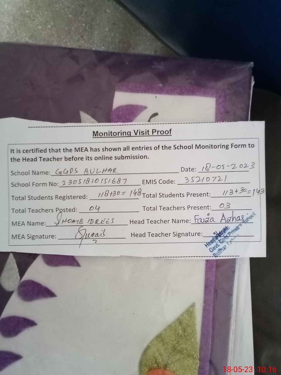 | Attendance Register | Head Teacher | MEA with School | Visit Proof |