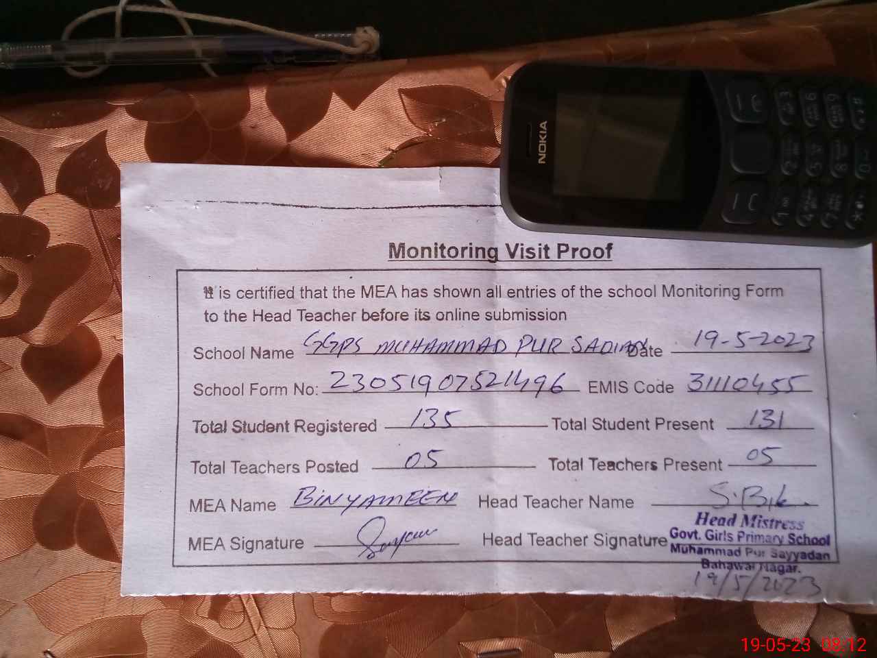 | Attendance Register | Head Teacher | MEA with School | Visit Proof |