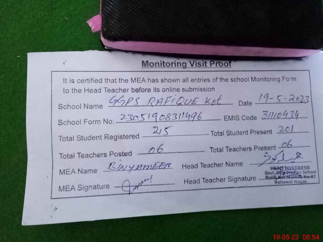 | Attendance Register | Head Teacher | MEA with School | Visit Proof |