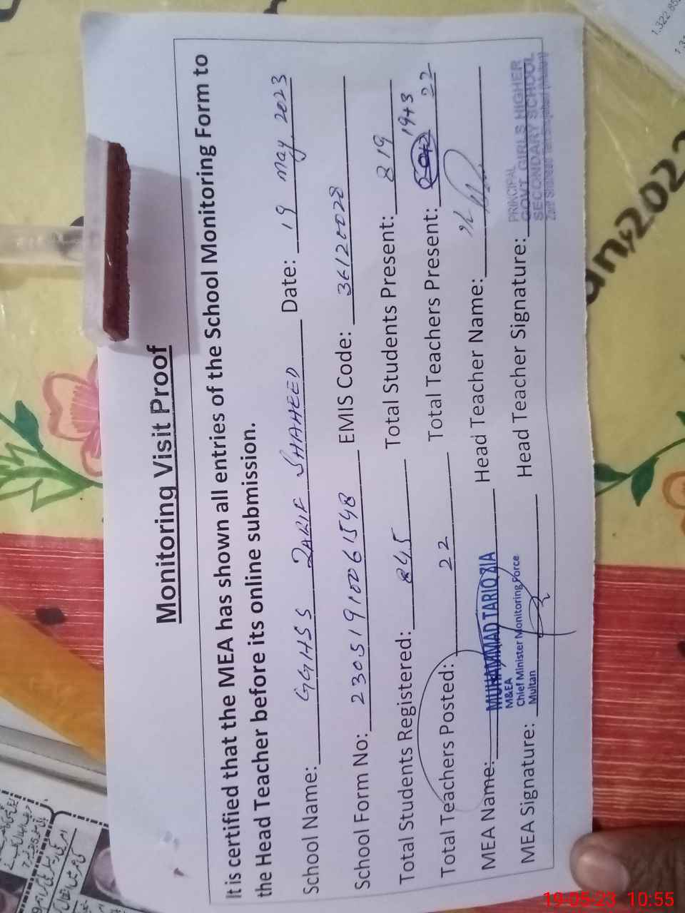 | Certified that this School was Inspected by the Undersigned MEA/DMO Today and the Information Stated Above is as Per Record. | |||||